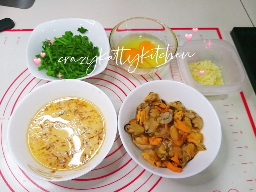 然后再倒入锅里煎,半熟再放入鸡蛋,然后全部推开一旁